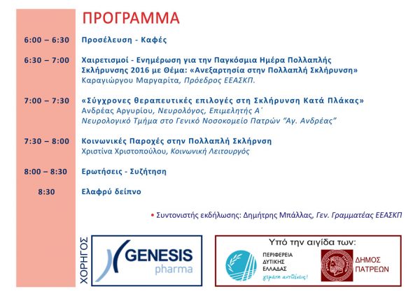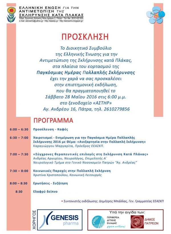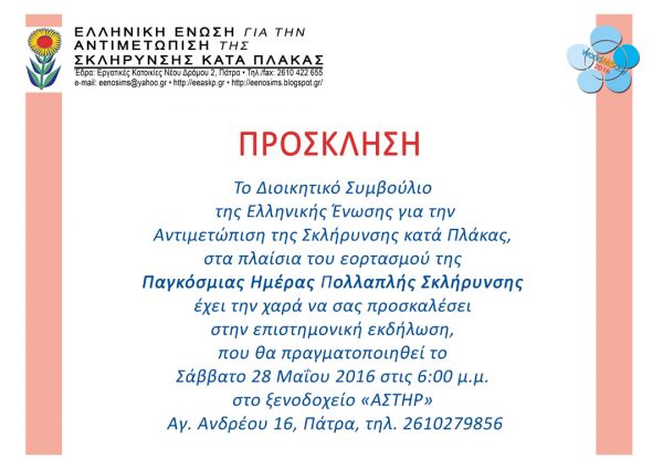 Το Διοικητικό Συμβούλιο της Ελληνικής Ένωσης για την Αντιμετώπιση της Σκλήρυνσης Κατά Πλάκας Δυτικής Ελλάδας, στα πλαίσια του εορτασμού της Παγκόσμιας Ημέρας Πολλαπλής Σκλήρυνσης έχει τη χαρά να σας προσκαλέσει στην επιστημονική εκδήλωση που θα πραγματοποιηθεί το Σάββατο 28 Μαΐου 2016 στις 6:00 μ.μ. στο ξενοδοχείο “ΑΣΤΗΡ” Αγίου Ανδρέου 16, Πάτρα (τηλ. 2610 279856).