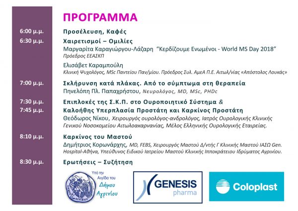 Η εκδήλωση τελείται υπό την αιγίδα του Δήμου Αγρινίου και είναι μια ευγενική προσφορά των εταιρειών “ΓΕΝΕΣΙΣ ΦΑΡΜΑ Α.Ε.” και “COLOPLAST - A. MΑΥΡΟΓΕΝΗΣ Α.Ε.”