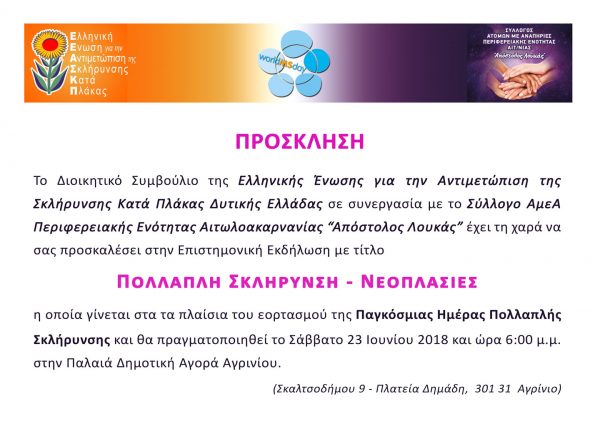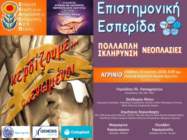 Το Διοικητικό Συμβούλιο της Ελληνικής Ένωσης για την Αντιμετώπιση της Σκλήρυνσης Κατά Πλάκας Δυτικής Ελλάδας σε συνεργασία με το Σύλλογο Ατόμων με Αναπηρίες Περιφερειακής Ενότητας Αιτωλοακαρνανίας “Απόστολος Λουκάς” έχει τη χαρά να σας προσκαλέσει στην Επιστημονική Εσπερίδα με τίτλο